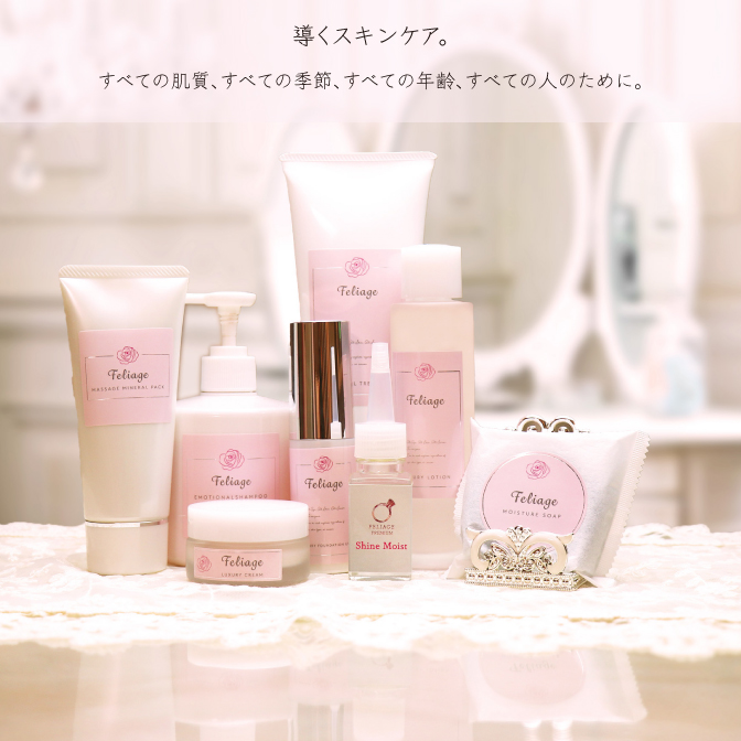 フェリアージュは全商品共通して、EGF*(ヒトオリゴペプチド-1)・フラーレン・カイネチンを配合した世界最高峰の高機能性を目指している化粧品ブランドです。